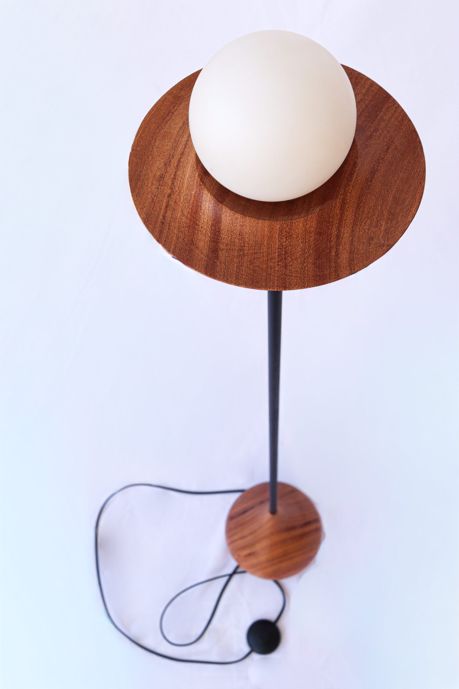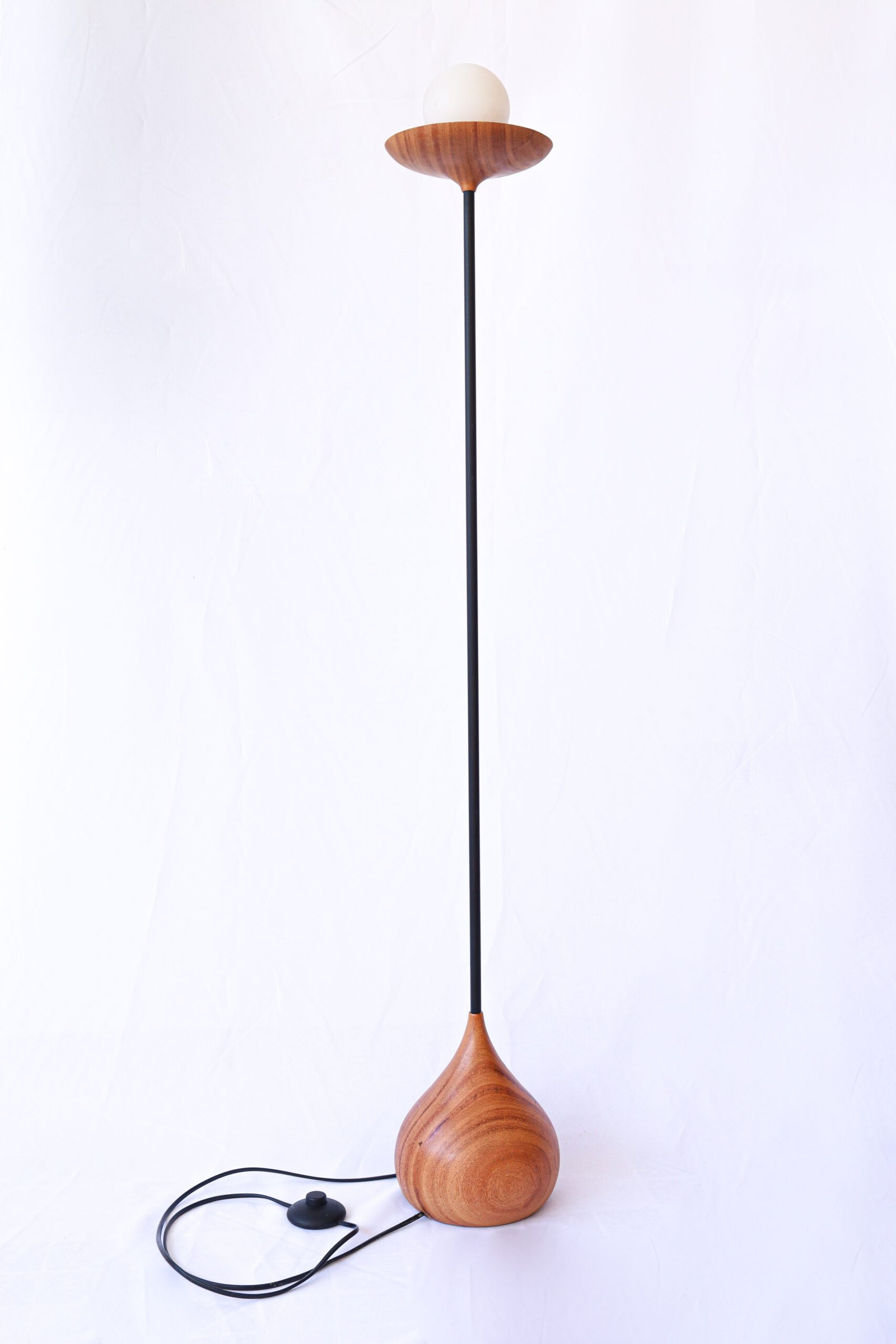 A Luminária NUAR combina madeira maciça torneada e haste metálica para criar uma peça leve, elegante e cheia de presença. Seu globo em vidro branco fosco distribui a luz de forma suave, trazendo aconchego e sofisticação ao ambiente.