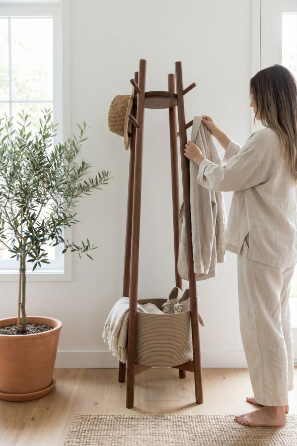 - Função: suporte para casacos, bolsas, chapéus e acessórios